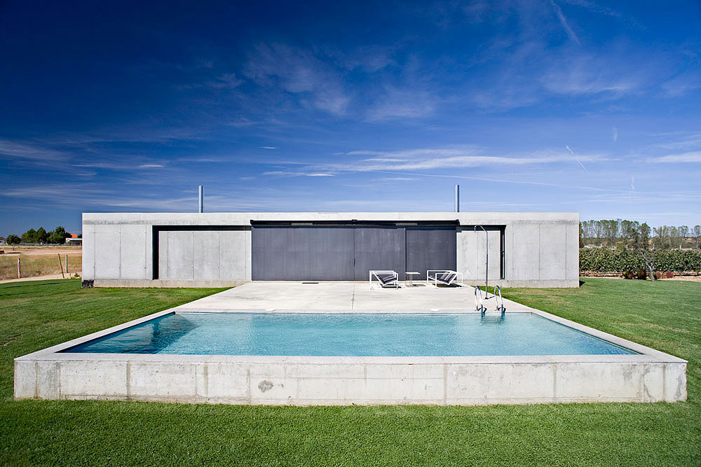 Este paralelípedo puro de hormigón, roto en su parte central por dos cristaleras en las caras norte y sur, está situado en el centro de un finca prácticamente plana de forma trapezoidal con dos partes claramente diferenciadas. Una es la zona norte, ocupada por un viñedo, y la segunda es la cara sur, poblada de árboles de hoja caduca (castaños, nogales, etc.) y caduca (pinos y encinas). Las amplias cristaleras (9 x 2,5 m) son las encargadas de conectar visualmente el viñedo y el arbolado.