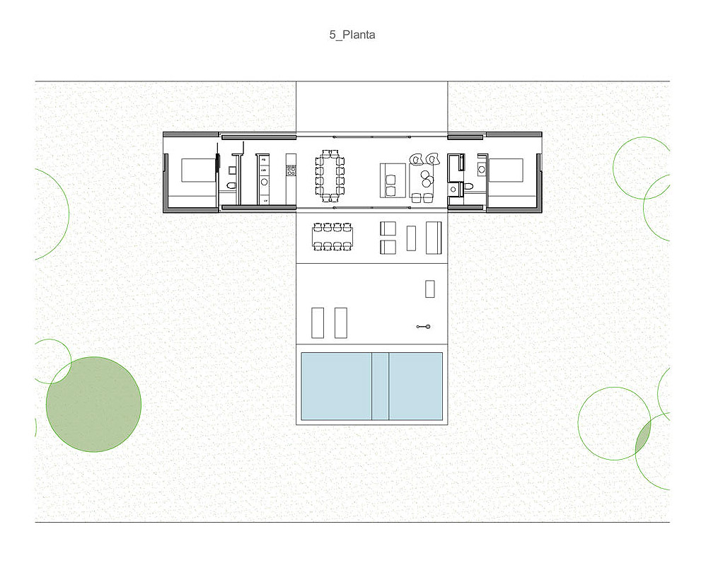 Por otro lado, la disposición de la piscina y los grandes ventanales que se abren a la zona de terraza permiten una prolongación del interior al exterior o del exterior al interior.