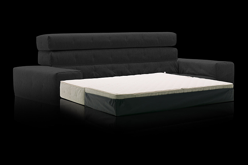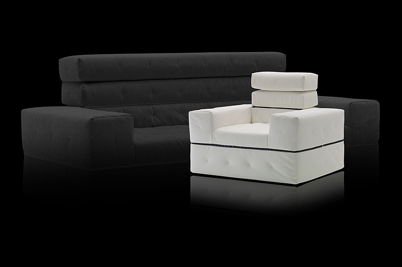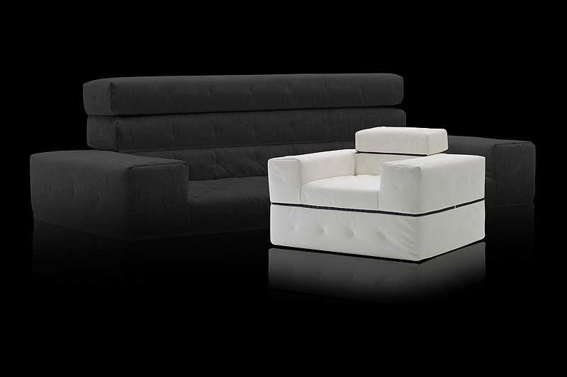 Un sofá cama de formas cúbicas que sin mecanismos adicionales se convierte en una cama individual, una cama doble o dos camas individuales. Con su respaldo ajustable en dos posiciones, está diseñado para satisfacer las necesidades de una cama adicional. La funda pespunteada y desenfundable se puede hacer con tela estándar o con PVC para interior o exterior. El relleno es de poliuretano expandido HR 30 Kg/m3.