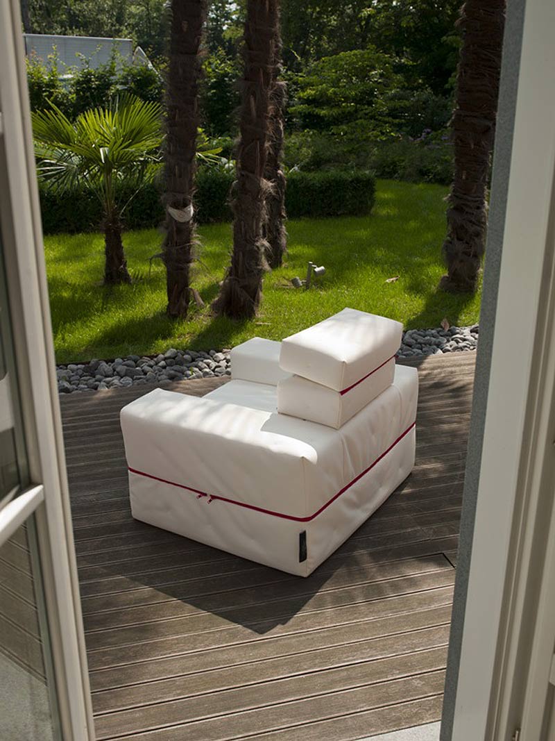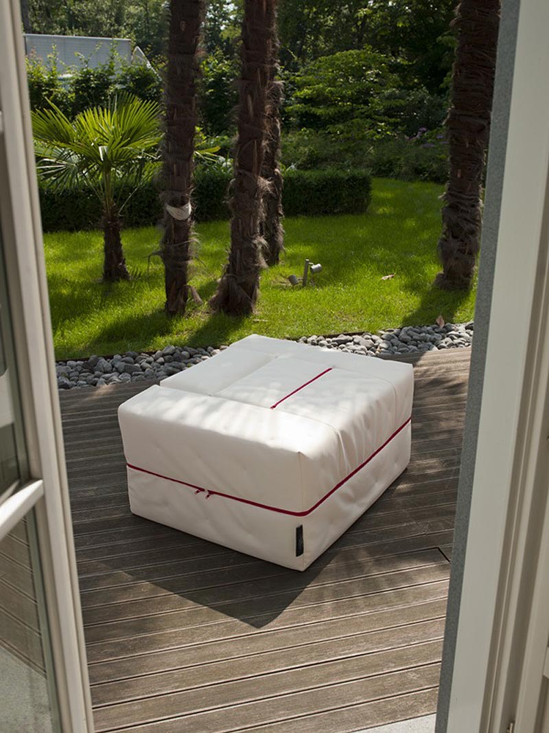 Un proyecto joven de una joven diseñadora que ofrece soluciones inesperadas, un práctico puf con medidas y peso reducidos gracias a la falta de mecanismos. Booklet se transforma en una cama ocasional, individual o doble, o en un sillón informal con posiciones diferentes. La funda desenfundable se puede hacer con tela estándar o con PVC indoor /outdoor. El relleno es de poliuretano expandido de 25 Kg/m3.