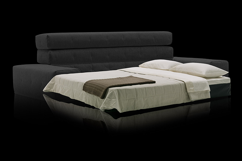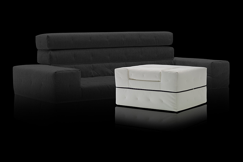 Un sofá cama de formas cúbicas que sin mecanismos adicionales se convierte en una cama individual, una cama doble o dos camas individuales. Con su respaldo ajustable en dos posiciones, está diseñado para satisfacer las necesidades de una cama adicional. La funda pespunteada y desenfundable se puede hacer con tela estándar o con PVC para interior o exterior. El relleno es de poliuretano expandido HR 30 Kg/m3.