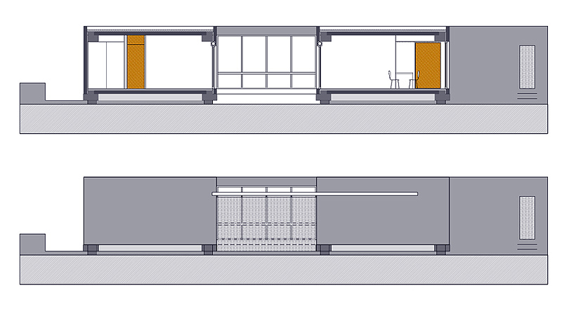 La vivienda, que se desarrolla en una sola planta, se compone de dos volúmenes idénticos abiertos al jardín y a un patio interior, y cerrados a la visión de los vecinos. El primer volumen alberga el área de día: un espacio abierto y flexible con el estar-comedor y la cocina que, aunque comparten el mismo espacio, se encuentran parcialmente separados por una pared.