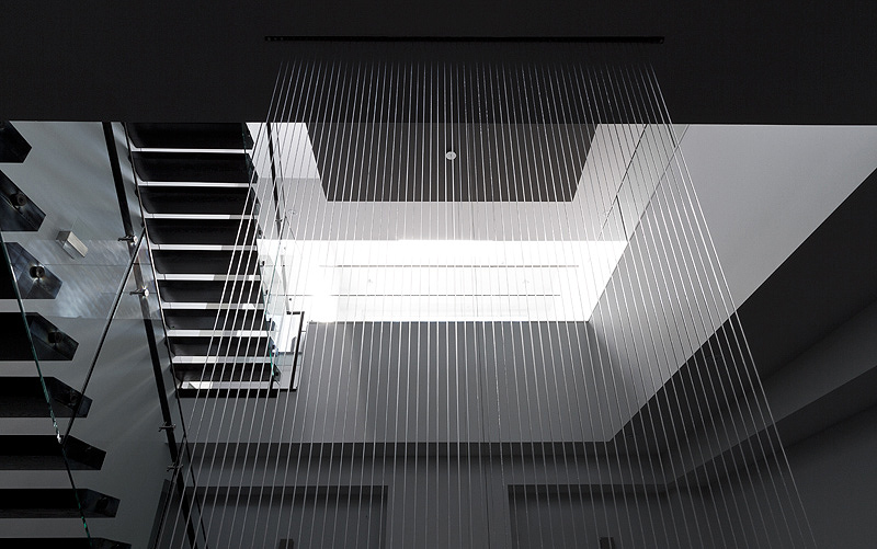 Sin abandonar este último espacio de la vivienda, la piscina que se ha ubicado en él ayuda al sistema mecánico a producir una cantidad razonable de humedad y a la creación de un microclima. El sonido del agua cayendo en la piscina junto con la luz natural suavizan la atmósfera y crean un poético lugar para vivir.