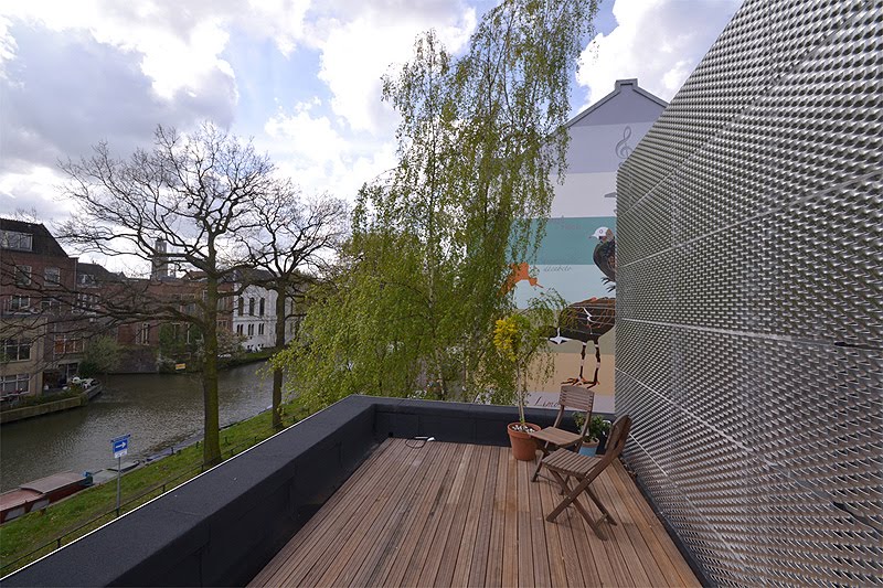 La terraza de la azotea, que actúa como un jardín, ofrece una bella vista del canal. Debido a que esta terraza se «hunde» en el techo de la cocina, la relación entre el salón-cocina adyacente y la terraza se fortalece.