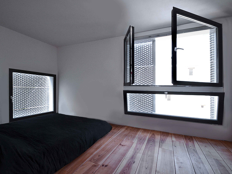 Esta malla de metal proporciona un interesante juego de luces en función de la hora del día: por la noche, el metal se ilumina por su parte posterior mientras por el día, las perforaciones proporcionan luz diurna difusa al interior. Al mismo tiempo, al colocar los paneles perforados de aluminio al revés, se protege el interior del edificio de las miradas de los curiosos.