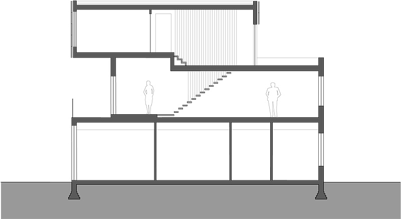 Los diferentes pisos están unidos a través del hueco de la escalera ocupado por un armario vertical, donde se apoyan los escalones volados a modo de estantes lo suficientemente amplios para ser utilizados como bancos de lectura.