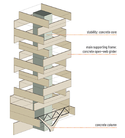Por otra parte, gracias al núcleo fijo de ascensores y escaleras en el corazón de la construcción, se han evitado las restricciones en la distribución de los apartamentos. Este núcleo también sirve para estabilizar la torre, que se encuentra en una zona sismológicamente activa.