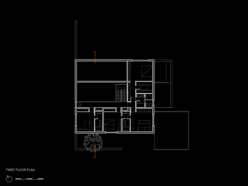 La planta primera, más allá de la vinculación visual directa entre el distribuidor lineal y la doble altura, está formada por una sucesión de habitaciones y baños. Todas las habitaciones se abren al exterior mediante grandes aperturas. Cada habitación, a una fachada distinta: la intención es particularizar cada uno de los locales otorgándoles diferentes vistas y asoleo. Este recurso también permite dar más masa al volumen superior y generar fachadas equivalentes, potenciando así su carácter monolítico.