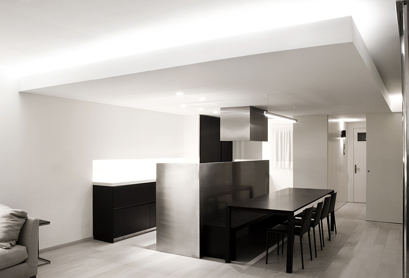 Una estudiada iluminación ha servido para subrayar el juego geométrico de los cortes de los falsos techos y en los nichos de las paredes y, al mismo tiempo, definir los volúmenes emergentes desmaterializando sus límites.