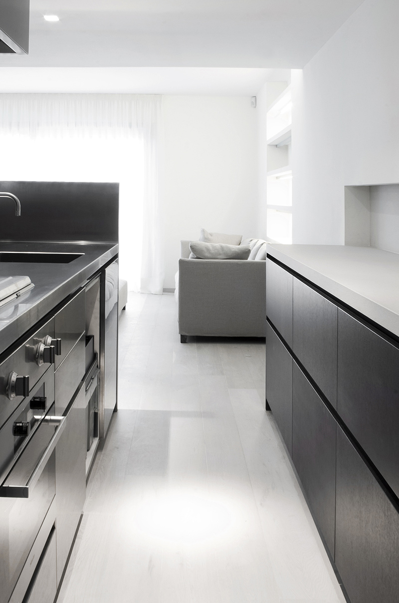 A la vivienda se accede a través de un pequeño acceso totalmente revestido en paneles de madera lacada blanca y abierto a una amplia zona de estar en la que destaca la cocina en madera oscura y acero inoxidable. Un falso techo a una altura más baja que el de la sala de estar sirve para definir el volumen de la cocina.