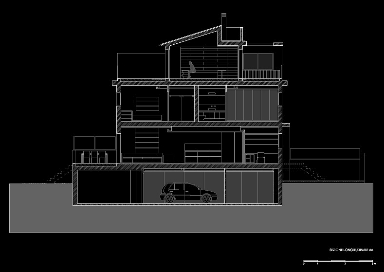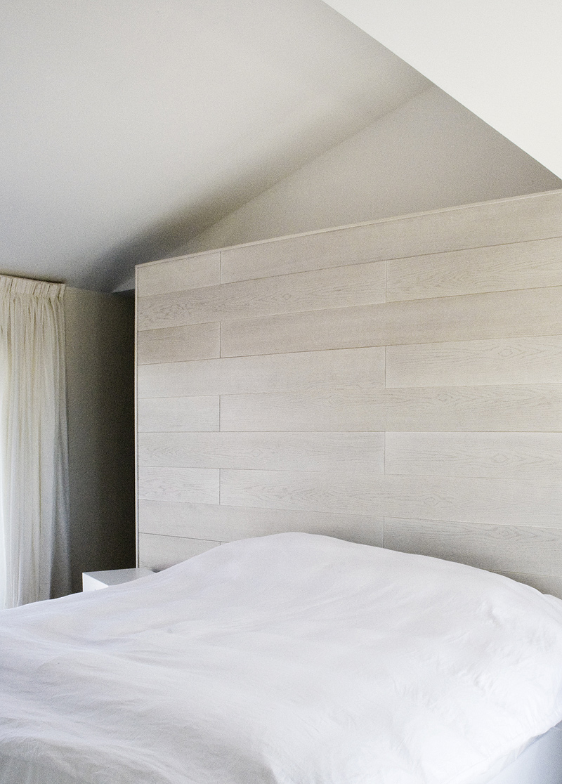 La habitación de matrimonio, en la última planta, se separa de la escalera sólo mediante una larga cajonera en roble blanqueado, que esconde indirectamente y en su cara posterior, una banda de luz indirecta.