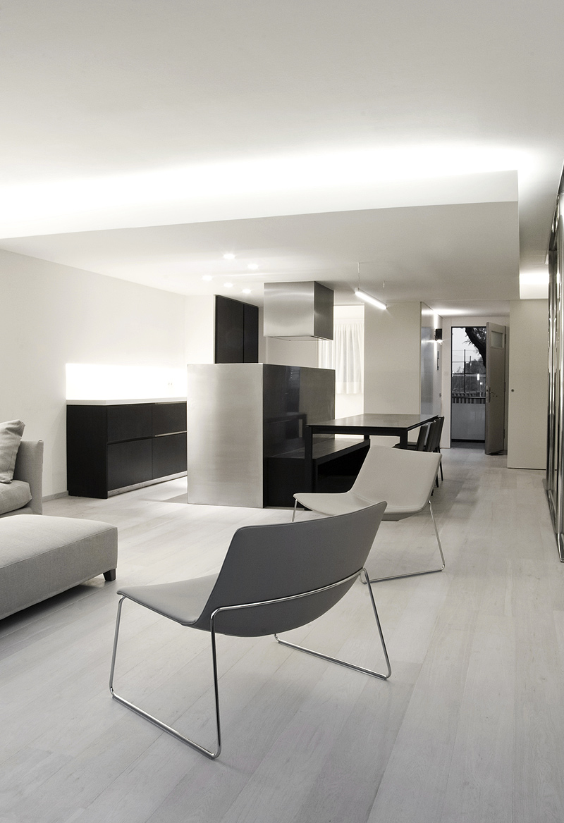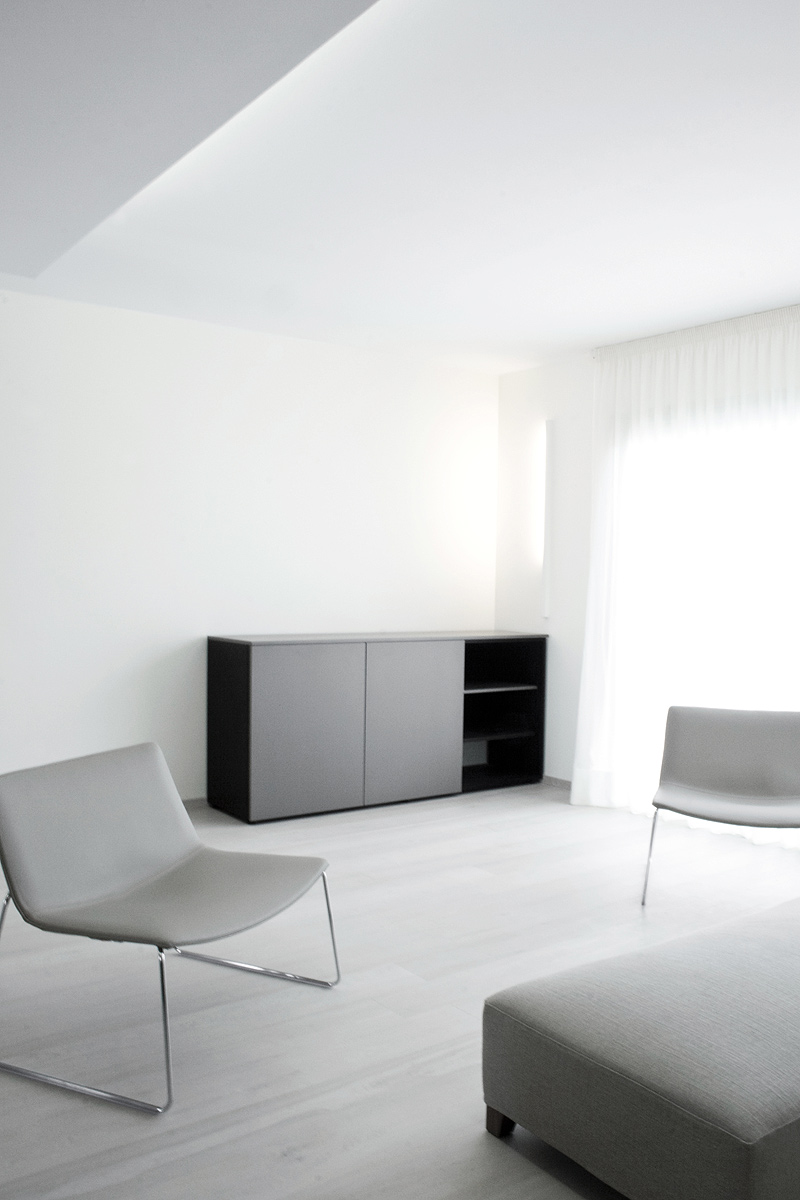 En el diseño se ha utilizado una amplia gama cromática de colores claros (desde el blanco hasta el beige) sobre paredes, pavimentos y techos, que ha contribuido a que se desdibujaran los límites del espacio. A partir de esta piel neutra, emergen como garantía de un fuerte y evidente contraste, volúmenes monolíticos en metal o madera oscura.