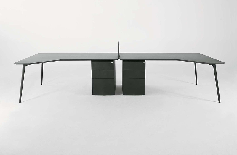 Como mesa de trabajo, la colección incorpora una versión buck con dos cajones pequeños y uno inferior más grande, disponibles en las mesas individuales y con alas. Además, presenta la opción de poder ocultar los cables en un bolsillo de poliéster ignífugo, situado bajo el sobre.