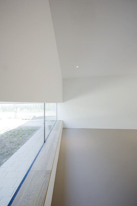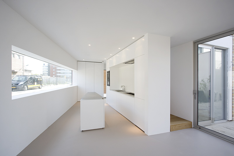 La vida de sus habitantes transcurre entre la intimidad que les ofrece el patio interior y la visión que tienen del exterior a través de dos grandes paneles acristalados deliberadamente largos y estrechos. Esta aberturas permiten que la característica luz holandesa penetre en los diferentes espacios de la casa y, al mismo tiempo, acentúan la horizontalidad del conjunto de la vivienda.