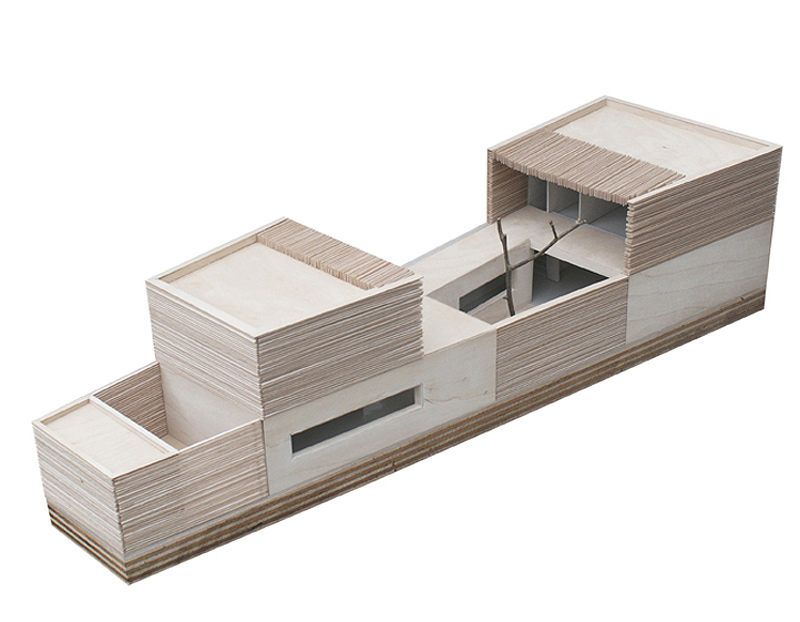 Los arquitectos han dividido la casa en dos volúmenes de dos pisos, ubicados en extremos opuestos. Uno es «la casa de los niños» y la otra, «la casa de los padres». La comunicación entre ambas tiene lugar en la distancia a nivel visual, a través del patio interior, a nivel de suelo, y mediante una pasarela que une las terrazas de los pisos superiores.