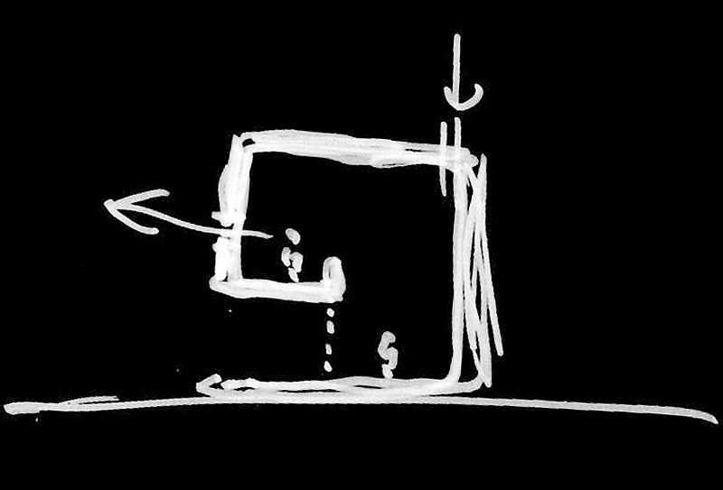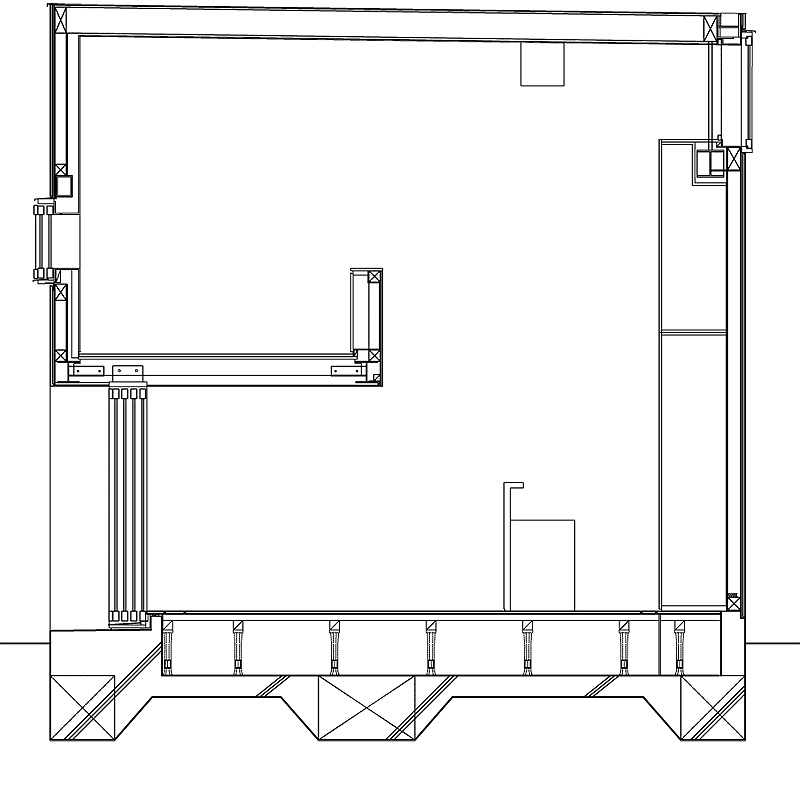 Tras ascender por una ligera escalera blanca, se llega a la zona del dormitorio. Ésta se ha dispuesto en un altillo abierto a la primera planta. El vacío que pone en comunicación los dos niveles se ha transformado en una amplia zona de almacenaje. La pared se ha revestido con un enorme armario que recorre la pared de abajo a arriba, exceptuando una larga franja horizontal ya en contacto con la cubierta, destinada a ventana. Este mismo armario sirve para camuflar parte de la cocina y un pequeño aseo que dispone de sanitario y lavamanos.