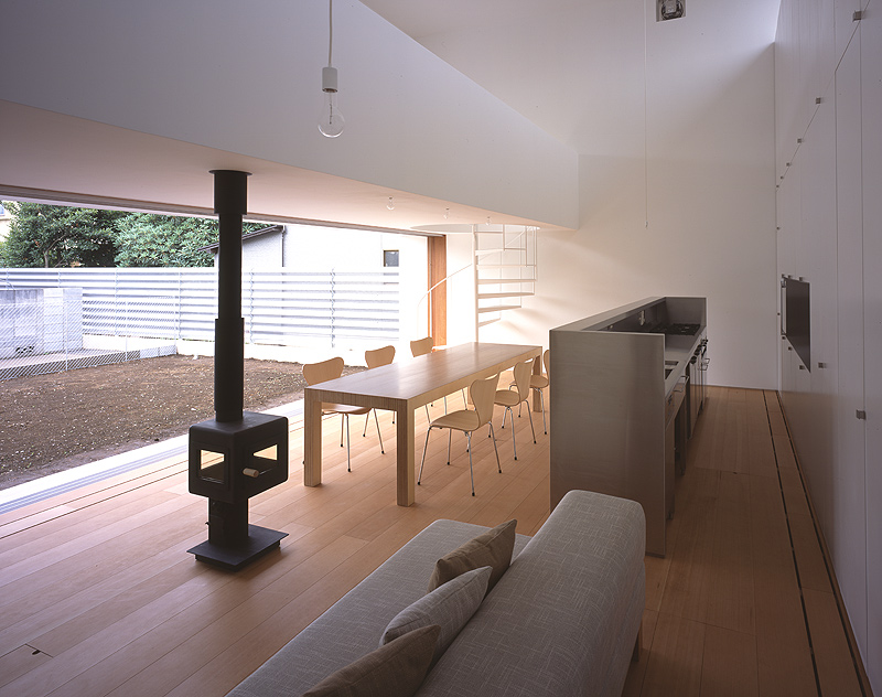 Los interiores se rigen por los principios de la sencillez y el equilibrio, tanto en los equipamientos como en la gama cromática y los materiales que se utilizan. El color blanco, la madera y el delicado gris del acero inoxidable o de la tapicería del sofá proporcionan un ambiente equilibrado, acogedor y sereno, sólo roto por la chimenea negra cuyo tubo atraviesa el forjado del primer piso para ascender libremente hasta encontrar la cubierta de la casa.