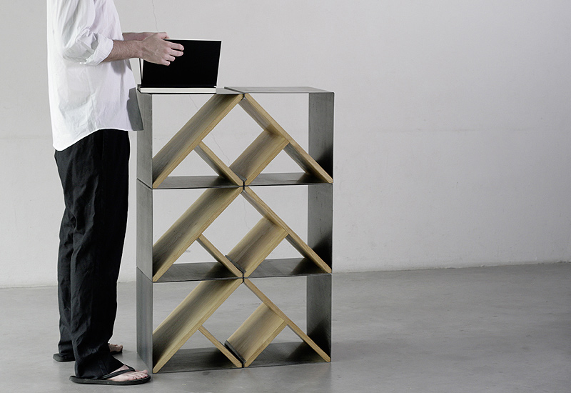 El taburete-estantería basa su fabricación en una sencilla hoja de acero combinada con dos láminas de madera de roble para evitar que el asiento combe. Uno de sus atractivos es que el acabado del metal es en bruto, tal como sale de fábrica, lo que significa que cada pieza adquiere su personal apariencia a través de un proceso natural.
