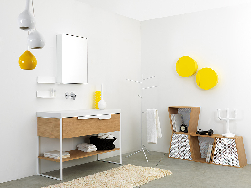 Mueble de lavabo exento de diseño esencial. La estructura de soporte y el tirador son en acero lacado en color blanco mientras que las puertas y los estantes son en madera lacada hidrófuga o en madera de roble natural. Está disponible en dos tamaños: 77 x 90 x 47 cm / 77 x 119 x 47 cm.
