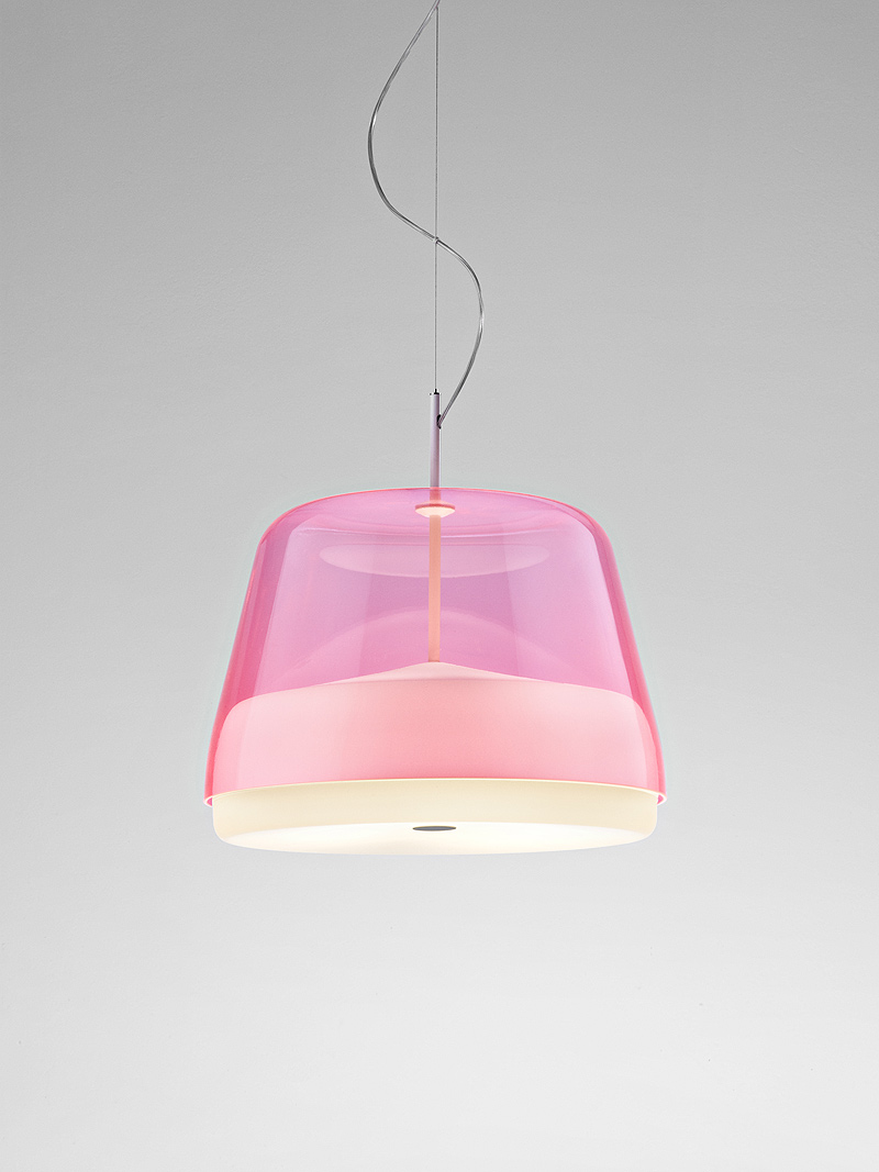 La luminaria de suspensión de Protasoni incorpora su propia fuente de luz con una forma similar a la de un recipiente de cristal con una tapa. De la interacción entre los dos elementos -el tambor opalino y el difusor superior en plexiglás transparente o coloreado (gris, rojo, esmerilado blanco opal)- surge La Belle: una lámpara de líneas suaves y colores contemporáneos para un efecto de agradable luz difusa. El difusor inferior es de polietileno blanco.