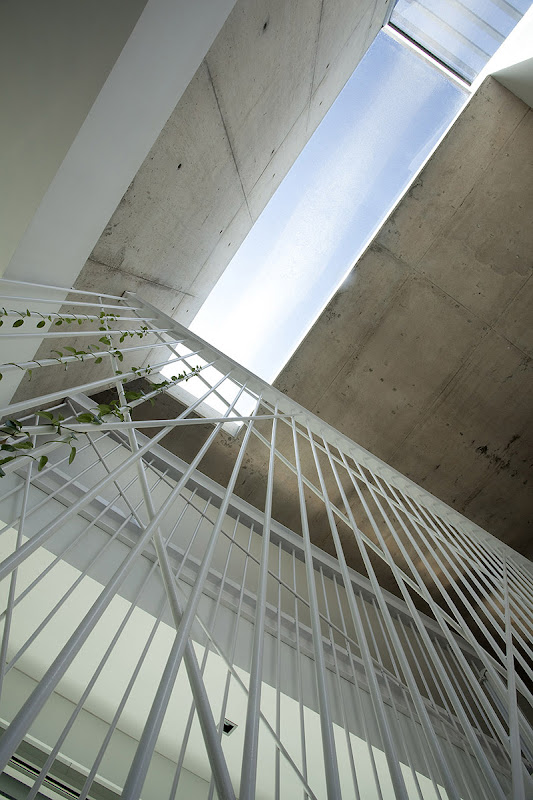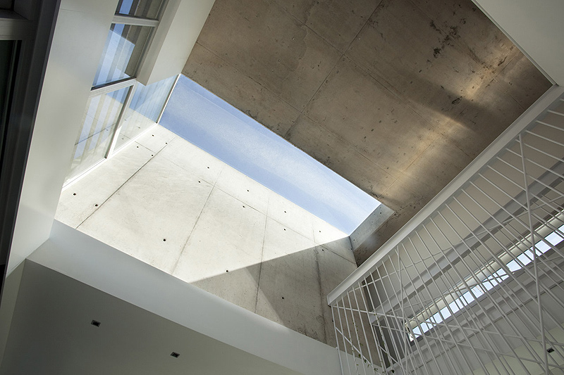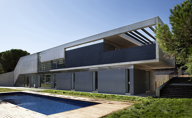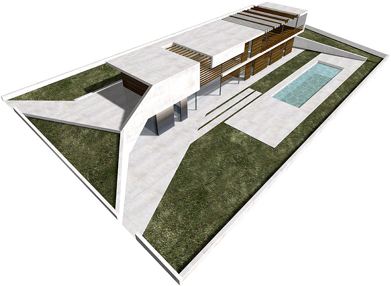 La vivienda, desarrollada longitudinalmente para conseguir la mayor superficie posible de zona ajardinada, se ha planteado con accesos diferenciados para cada uno de sus dos niveles. El imponente volumen surge de la fusión de estas dos ramas de acceso, que nacen en la calle principal, y se eleva para constituir la primera planta, haciendo que el hormigón se vuelva ingrávido y parezca flotar.
