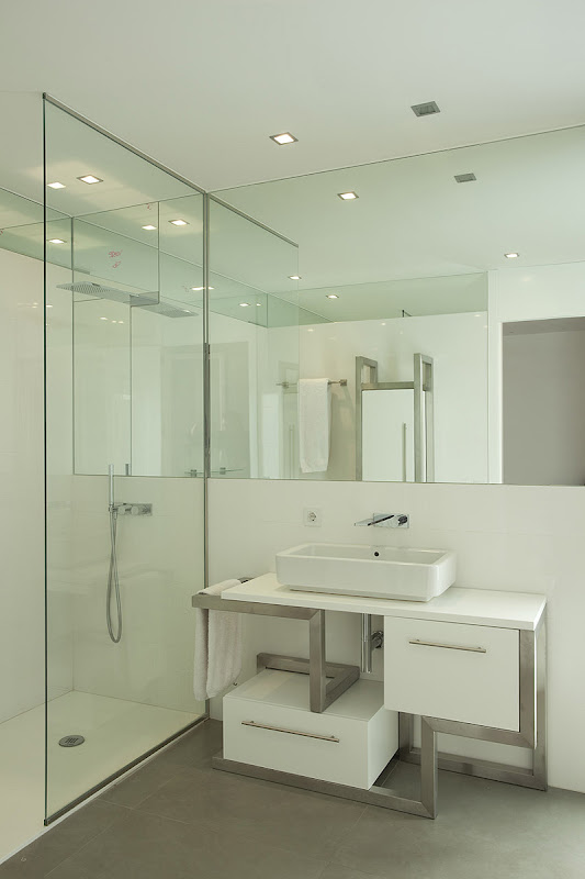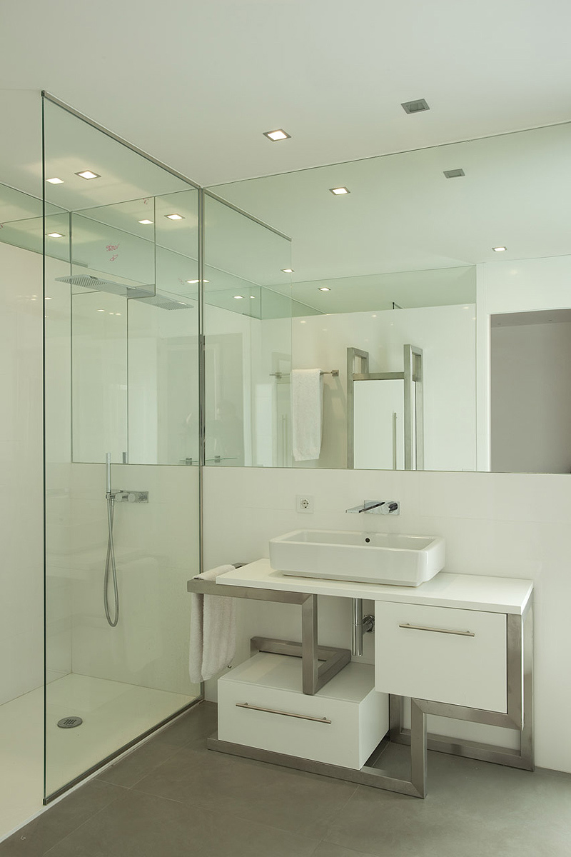 Al primer piso, se asciende por una escultural y liviana escalera construida con redondos calibrados del 20, con los que se ha conseguido una gran rigidez. Las vigas IPE200, que sirven de soporte a los peldaños colgados, se atornillaron al hormigón mediante una placa de la dimensión de la cabeza de la viga.