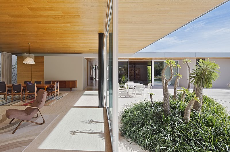 Esta relación entre los espacios interiores y los exteriores se intensifica con la continuidad cromática del suelo, las amplias zonas acristaladas y las aberturas en las cubiertas, que hacen que los límites se desdibujen. De este modo, «se buscó llevar la casa y el paisaje a una unidad superior en la cual el diseño residencial proporciona un marco para apreciar la naturaleza».