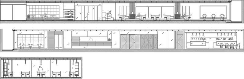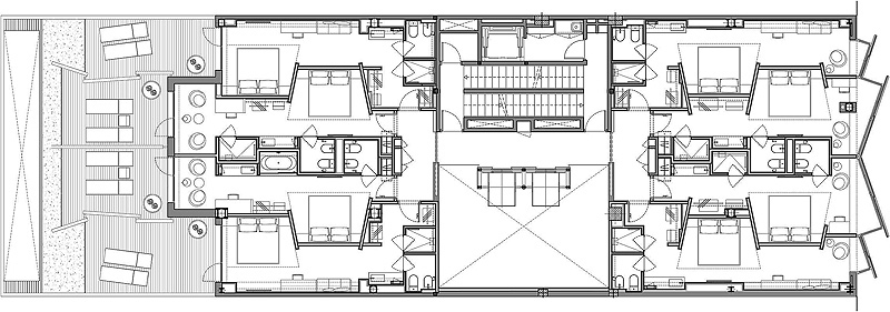 Dentro de las habitaciones, el baño se ha atomizado: sanitario, lavamanos y ducha / bañera ocupan un lugar propio, posibilitando el uso simultáneo de los mismos. La ducha y los sanitarios aparecen como cabinas o cajas de vidrio blanco, integradas en las paredes de la habitación, que se cierran con puertas de vidrio con serigrafías como una reinterpretación de elementos del “optical art” mientras el mueble lavamanos forma parte del mobiliario fijo de la estancia.