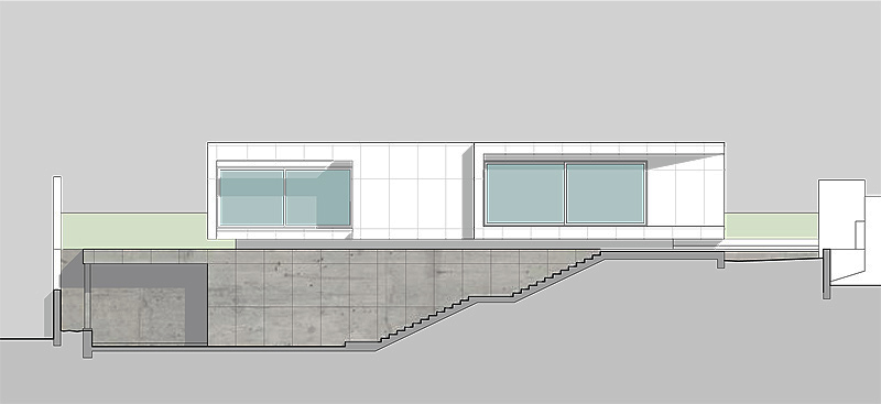El concepto de la nueva vivienda emerge, precisamente, de la observación de esta realidad. Además, tratándose de una casa familiar de grandes dimensiones para lo que eran los estándares locales, se optó por dividir el volumen en dos partes. La mitad de la edificación se «enterró» en el suelo como si formara parte de él. Sobre ella se construyó un segundo volumen, largo y aplanado, en hormigón visto blanco.