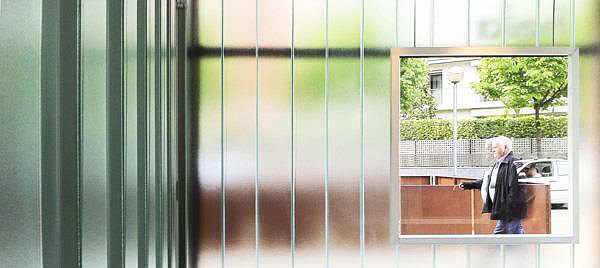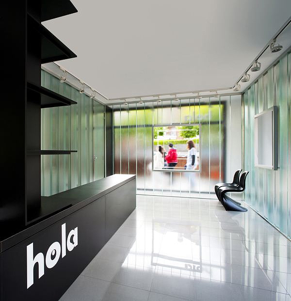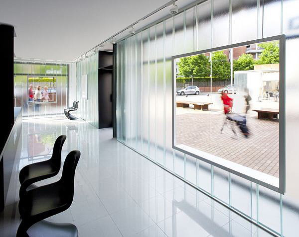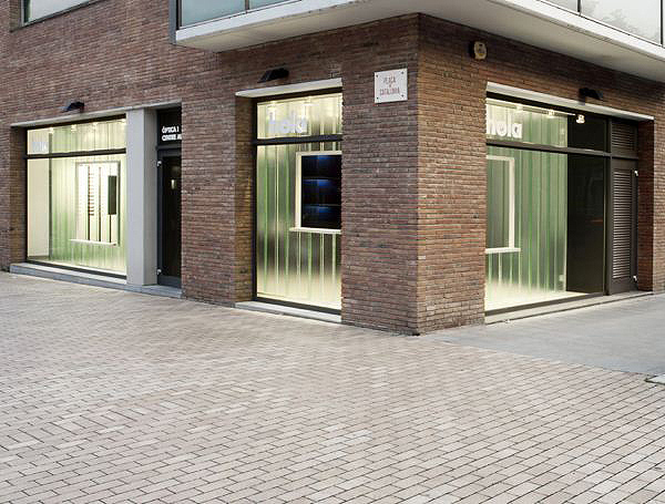 La colocación en greca, a pesar de no ser tradicional, funcionaba por su condición de cerramiento idéntico en las dos caras. Esta caja de U-Glass se dispone de manera que deja diferentes distancias a su alrededor, para dar respuesta a los diferentes requerimientos: allí donde están los escaparates se separa 60 cm. En cambio, deja mayor distancia en su parte posterior, la correspondiente a los despachos.