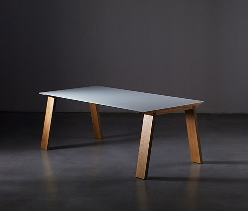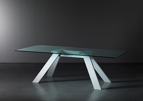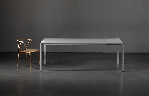 Una mesa fija o extensible, caracterizada por la pata de sección cuadrada, realizada en aluminio y chapa plegada de acero barnizada con polvo termoendurecido. Está disponible en blanco, amarillo, rojo y negro.