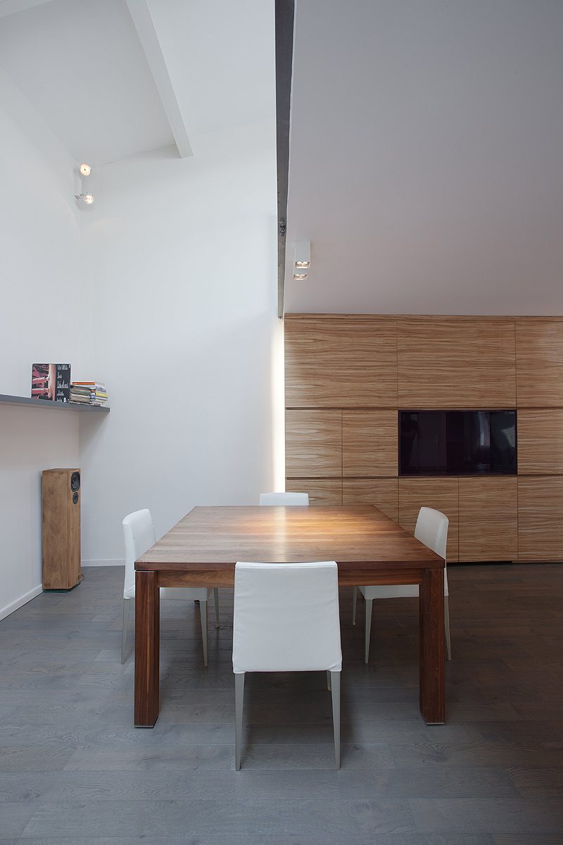 La dicotomía entre los fuertes lazos familiares y, al mismo tiempo, la independencia de cada uno de sus miembros se ha traducido en el uso de dos elementos –uno estéticamente muy llamativo, el otro casi intangible- , que podría ser percibido como denominador común de toda la casa. Estos dos elementos son la madera de zebrano, que he se ha utilizado en muebles, paredes, revestimientos… y una línea vertical imaginaria que atraviesa cada piso y se materializa solamente en la última sección, donde llega hasta el techo y se convierte en un cable de acero fijado a la viga central. Éste es deliberadamente muy visible y proporciona una apariencia muy metálica. Con él se transmite la idea de fuerza y ligereza al mismo tiempo, con personalidad pero no intrusivo.