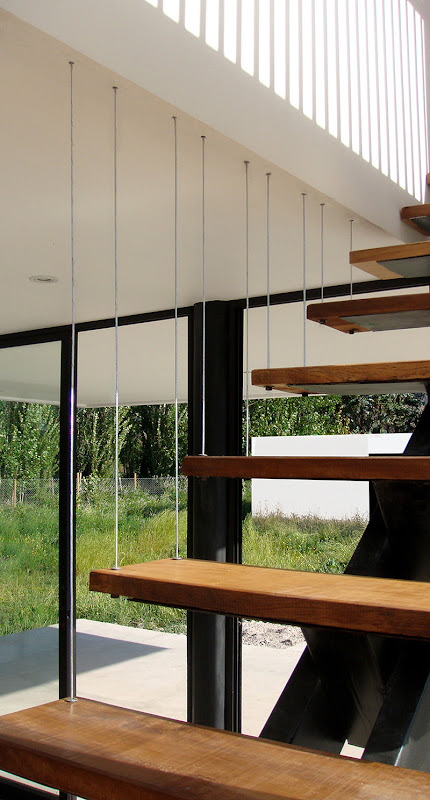 Por su connotación más pública, el volumen del primer piso se liberó para que se vinculara visualmente con su entorno a través de amplios paneles acristalados. Sin embargo, en el segundo nivel sucede totalmente lo contrario: es un espacio con vistas mas controladas y bastante más cerradas. Las piezas orientadas al este se encuentran con la vista frontal del muro natural que forman los álamos.
