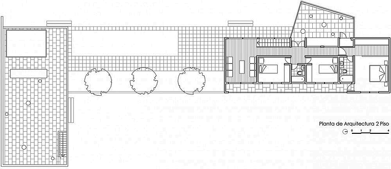 Los 350 m2 de superficie se distribuyen en dos plantas. En el primer nivel se ubican todos los programas públicos mientras que los programas más privados se reservan al segundo nivel. La piscina sirve para unificar la vivienda, la terraza y el quincho.