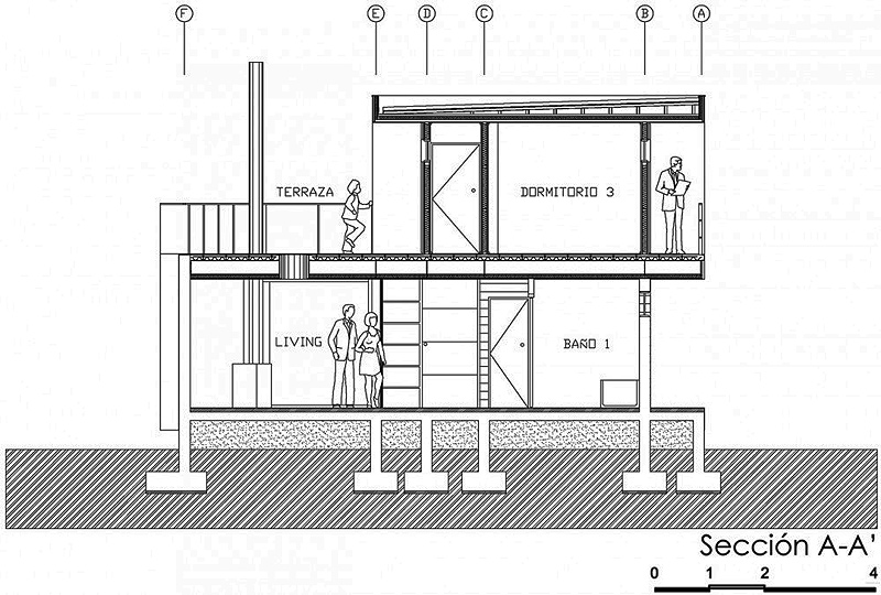 El sistema constructivo responde a dos situaciones: la primera, ligada al primer piso, es un sistema de marcos y pilares de acero de perfil circular y muros de hormigón armado que permiten suspender la casa en el segundo nivel. El segundo piso se ha resuelto a través de sistemas de estructuras metálicas y paneles revestidos en hormigón.