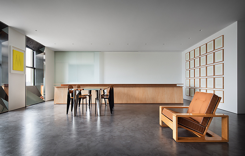 Dejándolo atrás, se abre un amplio espacio sobre un suelo de hormigón gris. La superficie del apartamento destila un aroma clásico y propone un diálogo silencioso entre el mobiliario modernista del siglo XX y el lenguaje más moderno del Museo de Arte Metropolitano (MMA), que se encuentra atravesando la calle.