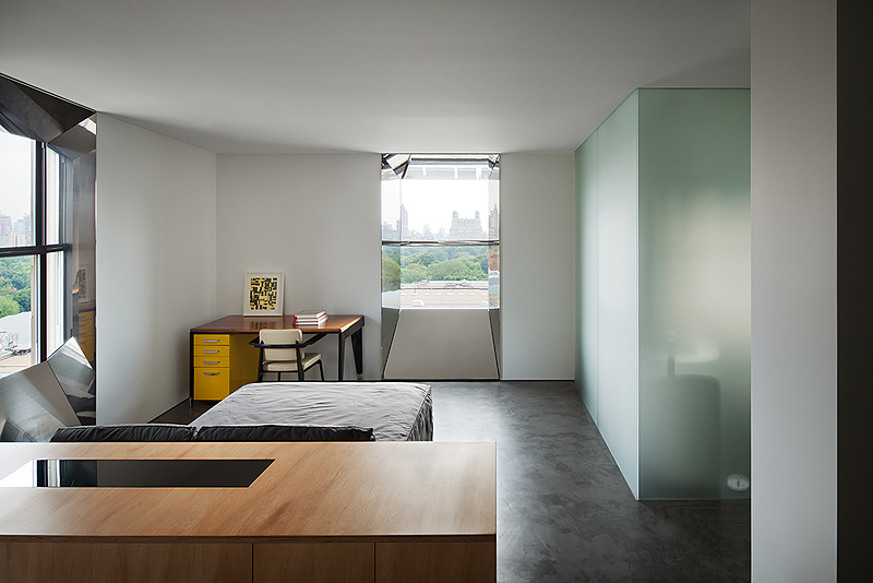 Mientras que las ventanas transforman las vistas sobre la azotea del Metropolitan en obras de arte virtuales, el loft se divide serenamente en dos espacios: el principal, que combina cocina y sala de estar, y un dormitorio, separados por un elegante mueble rectangular elaborado con madera de manzano.