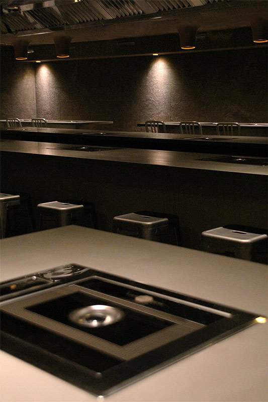 La combinación de las luces del techo que bañan puntualmente las mesas y las que iluminan las paredes unifican el espacio del restaurante y refuerzas la experiencia del comedor compartido. Además, los paneles espejados del sistema de extracción de humos en el centro de la zona de grill contribuyen a «aumentar» también el tamaño de la sala principal.