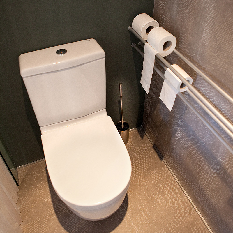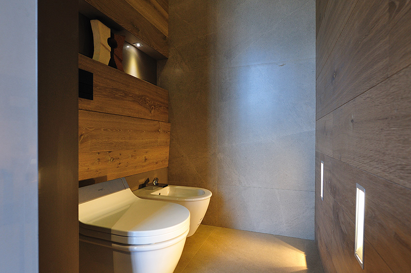 Una oscura habitación, sin ningún tipo de ventana, se ha transformado en este cálido baño que, con su amplitud y sus colores acogedores, proporciona un ambiente de relax sin olvidar el ahorro energético y el respeto al medioambiente. Cada pared del proyecto ha sido tratada con diferentes acabados y en él conviven distintas texturas y materiales (acero, vidrio, madera) que asumen el reto de «vivir la naturaleza en un espacio cerrado».