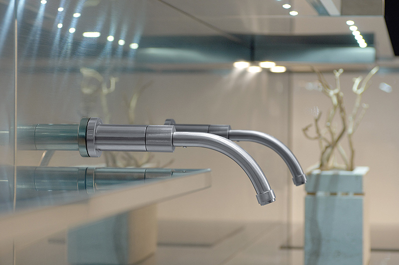 Arte Wall: monomando progresivo de pared con cartucho cerámico progresivo y regulador de caudal máximo-mínimo en el extremo del caño. Acabado en acero inoxidable. Altura recomendada: 25 cm sobre encimera.