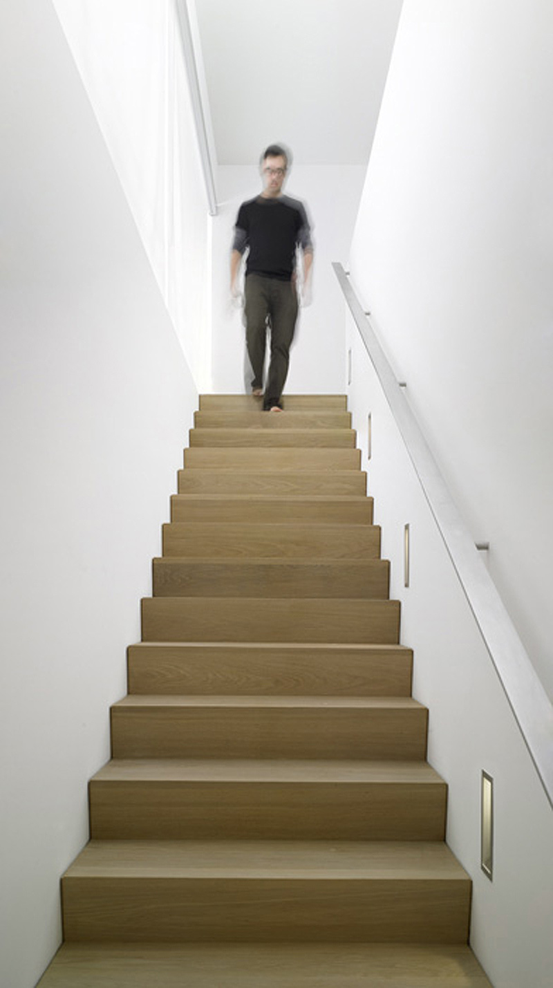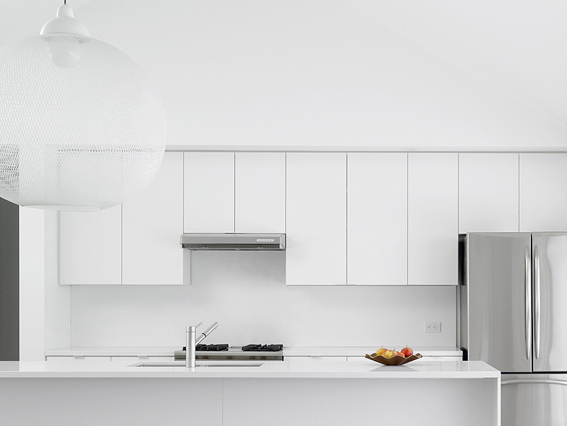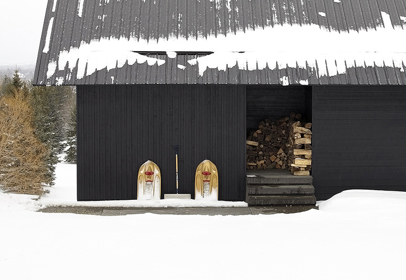 Este fuerte contraste entre el oscuro exterior sobre el paisaje blanco revierte en el interior, donde las blancas paredes y las generosas dimensiones de las ventanas disuelven las fronteras entre un espacio interior y un paisaje exterior vestidos por el mismo color blanco.