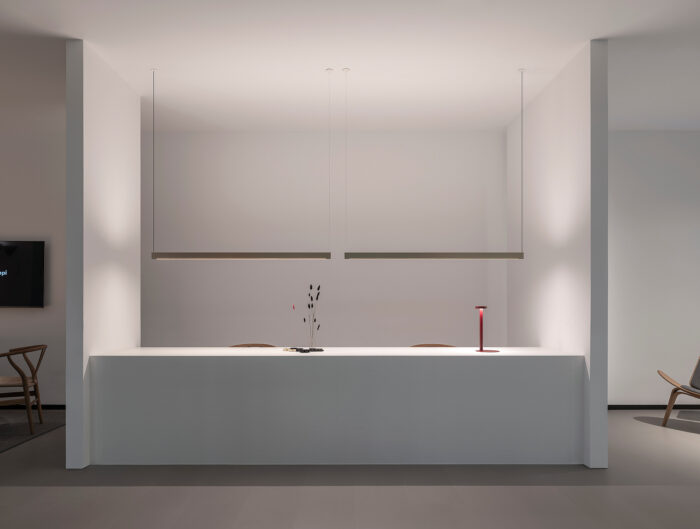 Incluso la iluminación, de Davide Groppi, se ha llevado a cabo con luminarias completamente ocultas: las lámparas Nulla salpican el techo como fuentes de luz muy distante, mientras que las luminarias Mima -diseñadas por el propio Delrosso-, integradas en las paredes verticales, emiten un flujo luminoso que ilumina el suelo oscuro.