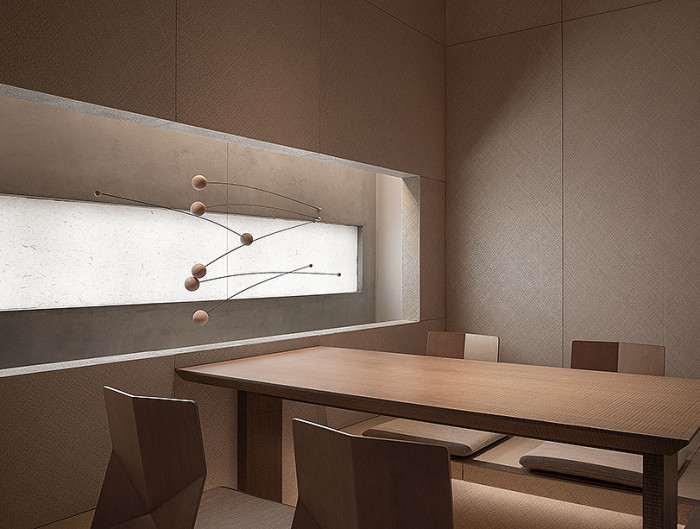 Las estancias washitsu (habitación de estilo japonés, generalmente con puertas correderas) están revestidas con paneles de ratán tejido combinado con obras de arte de piedra pintada, mientras que la zona de asientos de la barra utiliza paneles japoneses como revestimiento de paredes y techos, creando un ambiente sereno. El espacio general es una fusión del estilo zen japonés y la estética oriental minimalista. La zona final del comedor privado ofrece una escena vanguardista, creada con láminas de pan de oro, que se hace eco del carácter de Shanghái moderno y aporta una inesperada alegría.
