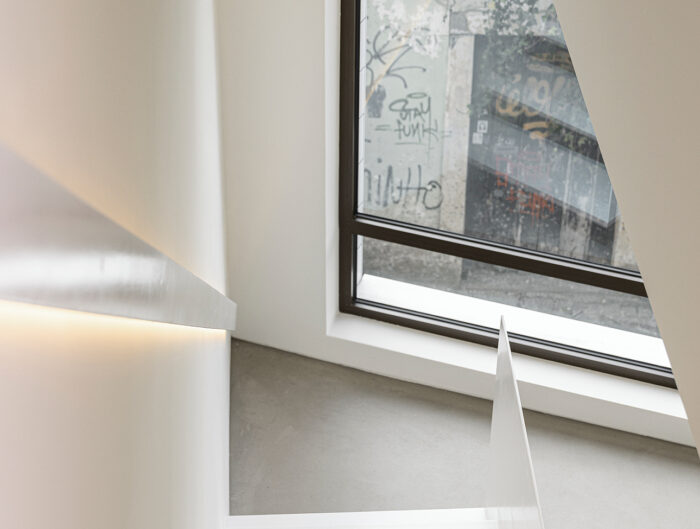 Para unificar formalmente los dos edificios y aprovechar al máximo el espacio de entrada, el edificio más pequeño se amplió en dos pisos junto a un completo rediseño de las fachadas. Esto no sólo contribuyó a mejorar el equilibrio estético, sino que también proporcionó más y mejor iluminación natural, y salubridad en todos los espacios. En el ático, se agregaron cinco ventanas abuhardillas para conseguir iluminación y ventilación naturales.