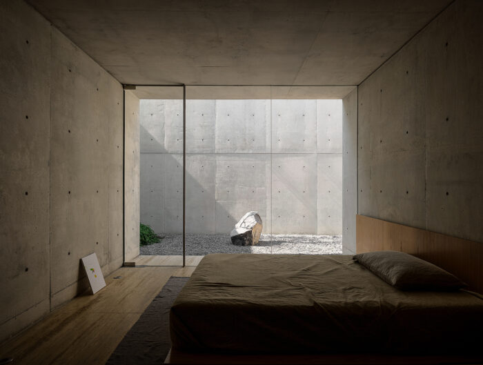Al frente, se colocó un pasillo de acceso que permite la entrada y oculta la cubierta, que se descubre más adelante. En el centro, un espacio diáfano alberga la sala de estar, el comedor y la cocina sin separaciones entre ellos. Al fondo, se oculta el refrigerador y se ubica el cuarto de servicio y almacenamiento, junto con la circulación vertical, o escalera, que conduce al ocupante a un pequeño vestíbulo. A su vez, ese camino conduce al baño y al dormitorio en el entrepiso. «Ese espacio es significativo en términos de diseño, ya que es el único elemento con una materialidad diferente: un volumen blanco que flota dentro de la casa. La elección del cambio de material busca difuminar su presencia o hacerlo parecer más liviano, como si fuera un trozo de algodón flotando en el espacio. Para lograr este efecto, era fundamental que la luz difuminara sus límites a través de la reflexión», explica el despacho mexicano.