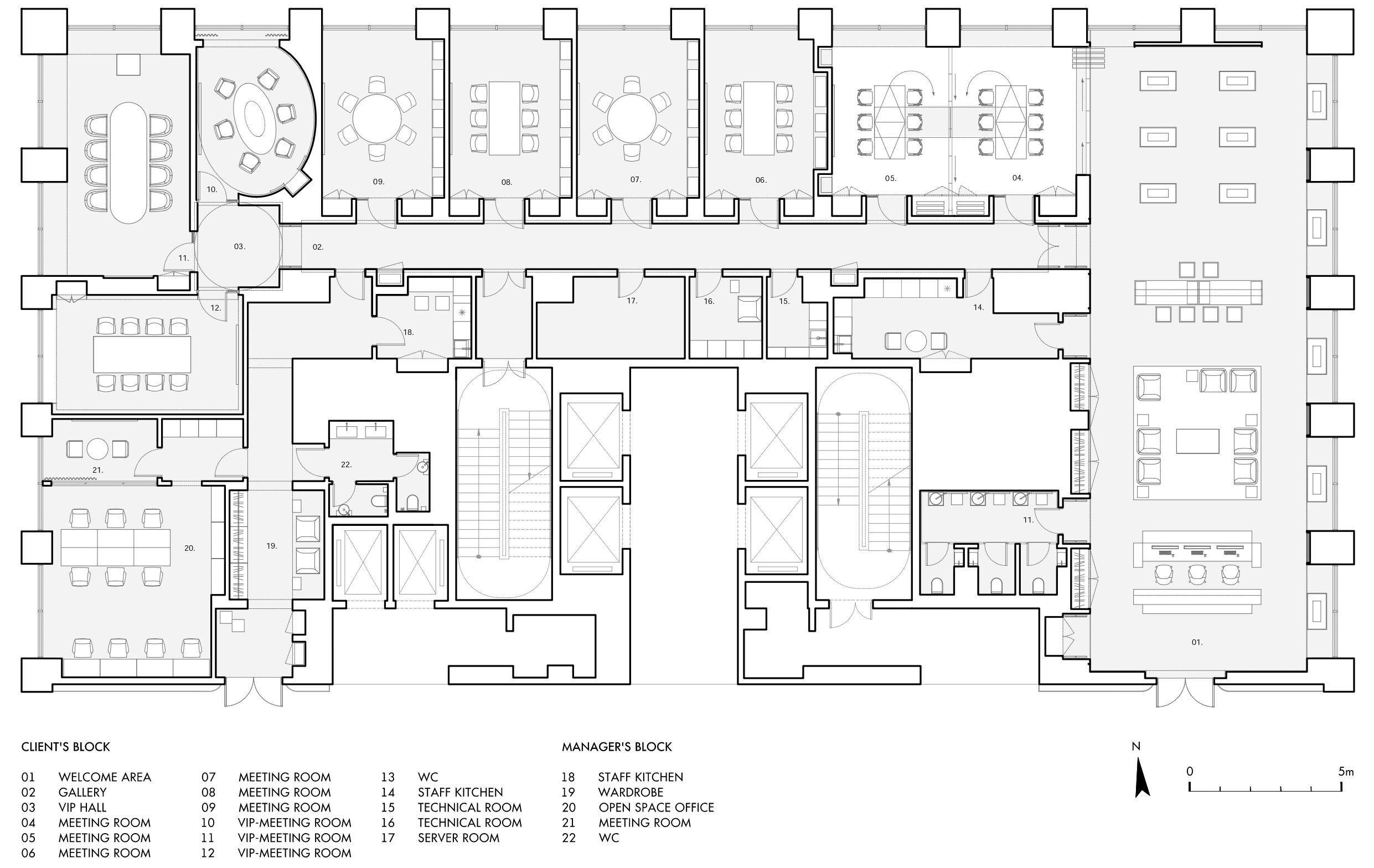 El recorrido por los interiores también se diseñó cuidadosamente, separando claramente los flujos de visitantes y de personal. De esta manera, la oficina cuenta con dos entradas distintas: a la izquierda, la recepción principal para invitados; a la derecha, la entrada para el personal, que da acceso a todos los espacios de servicio necesarios, incluyendo un espacio de trabajo diáfano para gerentes, una zona de descanso, baños, cocina y cuartos de servicio. Un elemento clave del espacio es el pasillo, que alberga nueve salas de reuniones. Los arquitectos recurrieron a un ritmo visual para acortar la sensación de longitud, dividiéndolo en dos secciones: un vestíbulo cuadrado, que se distingue por su techo circular y que conduce a las salas de reuniones prémium, y un pasillo lineal para las salas estándar. Las salas de reuniones se ubican a lo largo del lado acristalado, con las áreas técnicas y de servicio enfrente.