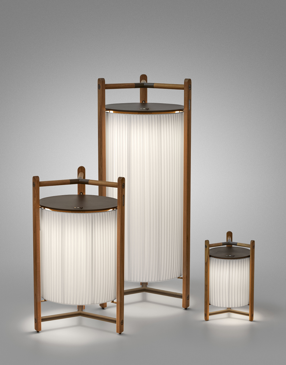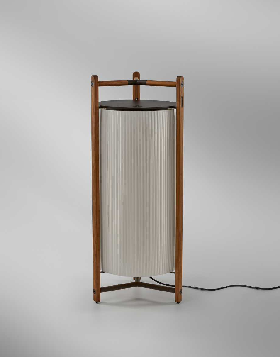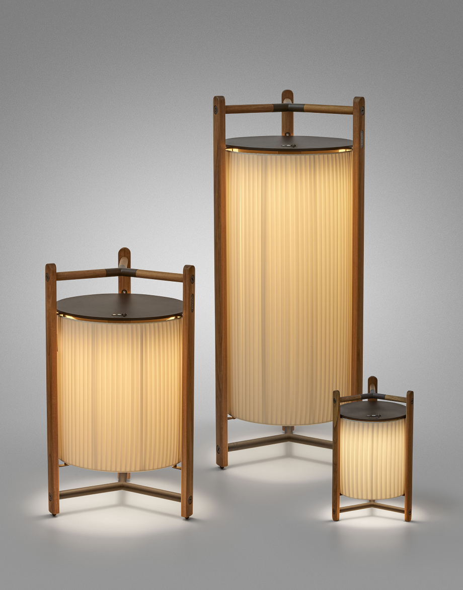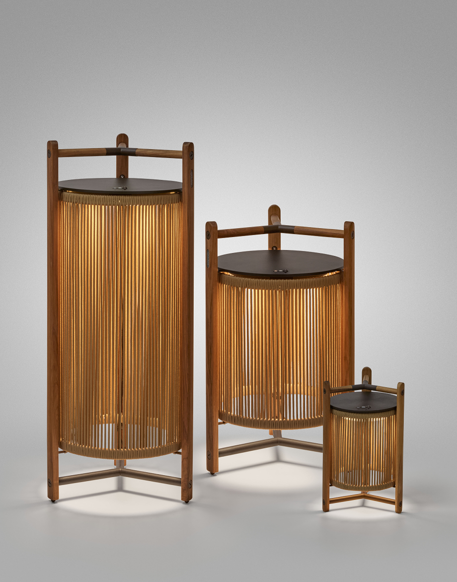 La pantalla se aloja en una ligera estructura de madera de teka, que también funciona como asa para facilitar su transporte. Las lámparas Kando emiten una luz cálida e íntima que se filtra a través del tejido de cinta en la versión indoor o del cordón náutico en la outdoor. Un rasgo distintivo de esta colección es la posibilidad de regular la temperatura de color mediante un pulsador manual, con opciones de 2200K, 2400K y 2700K. Disponibles en tres tamaños distintos, junto a las versiones para interiores y exteriores, estas luminarias de Bover se adaptan a diferentes necesidades y espacios.