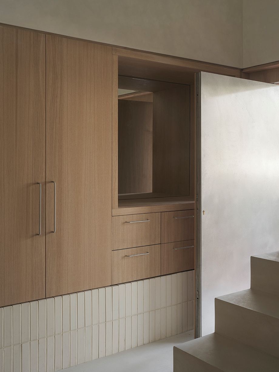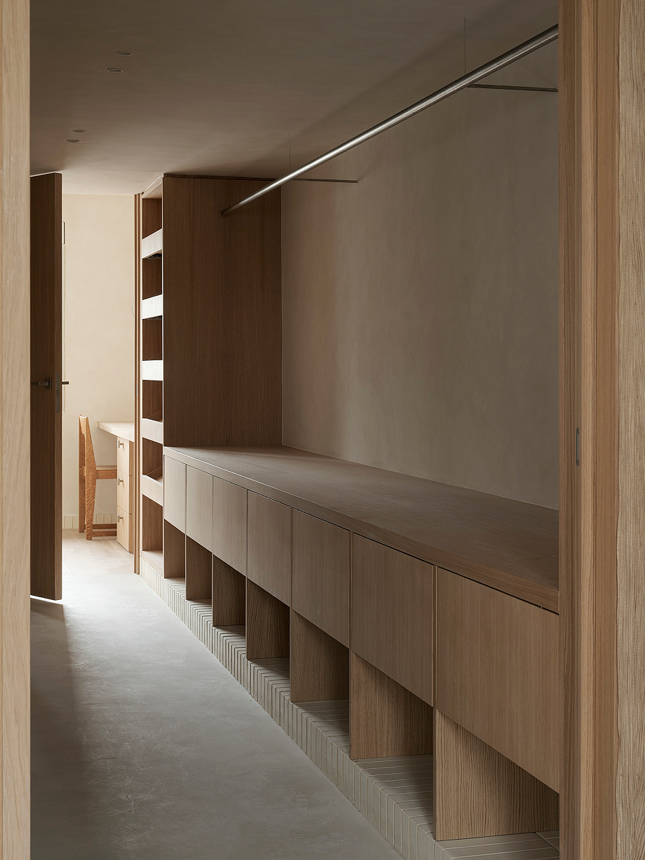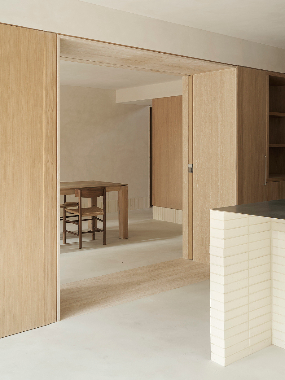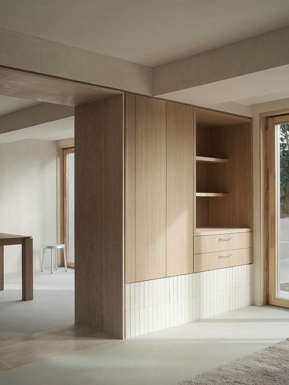 A través de una distribución radical y una implementación contundente pero sensible, la huella de la casa se dividió en tres bandas programáticas con un tamaño parecido a las que fueron incorporándose las diferentes funciones. La transformación de los ejes divisorios en muros equipados sirvió para acotar toda la planta. Estos elementos funcionan como armarios y, además, se perforaron para habilitar los pasos entre las estancias. El resultado es una secuencia de vistas encuadradas que ensalzan la continuidad y amplitud de toda la composición.