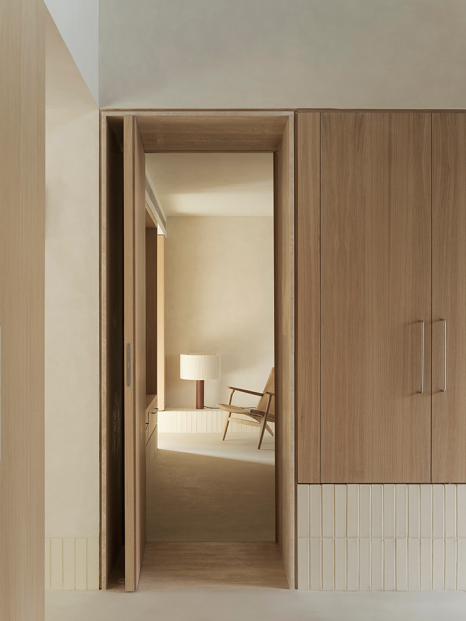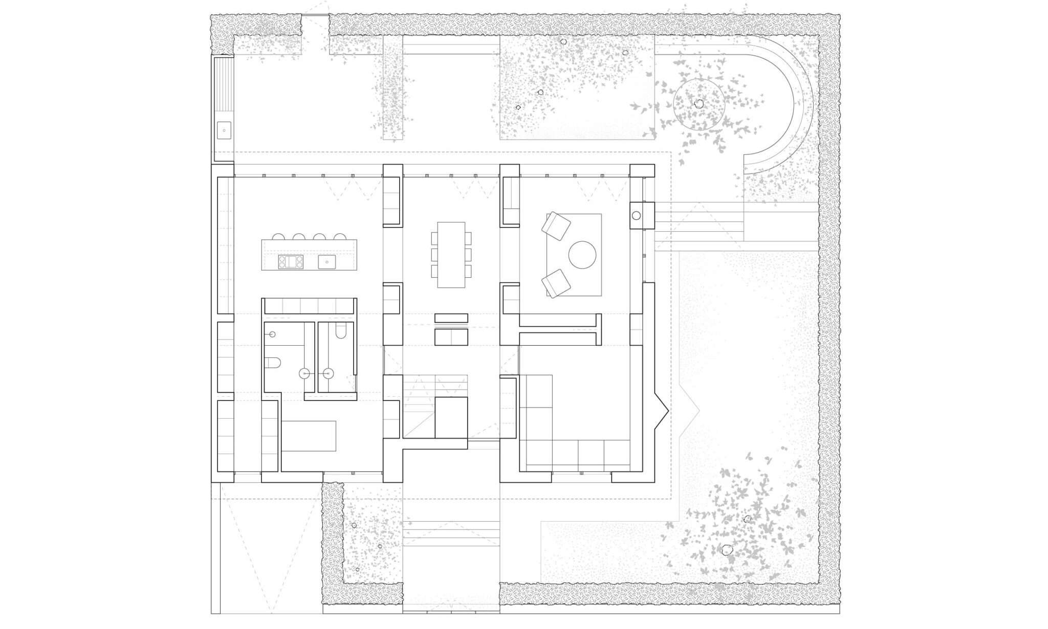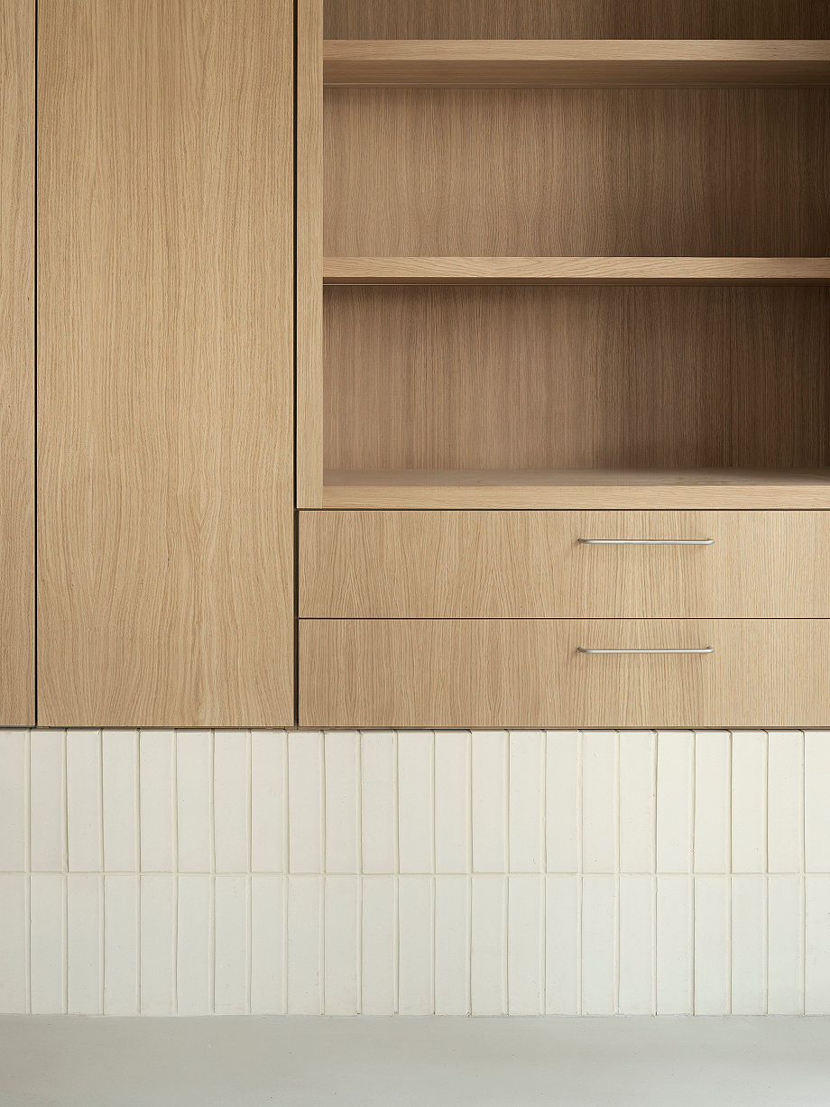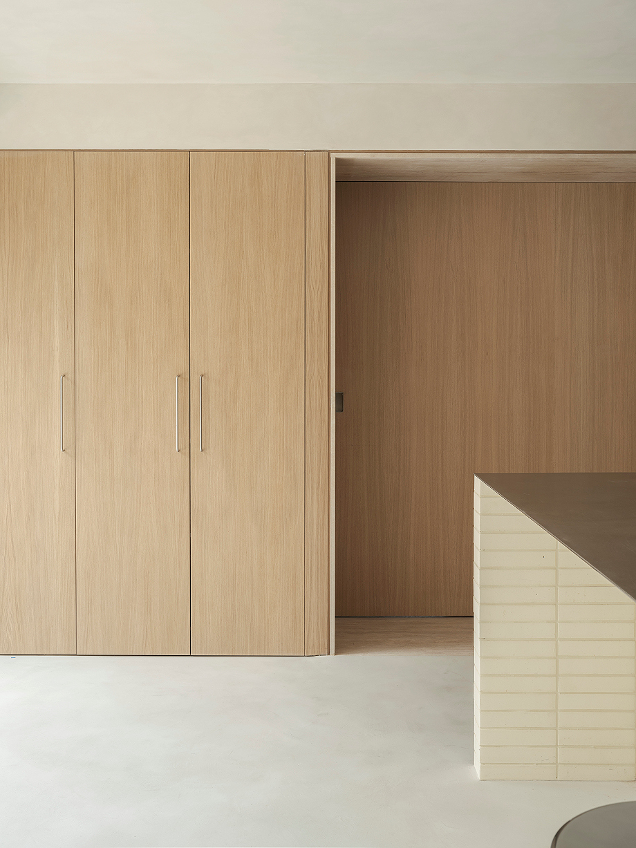 A través de una distribución radical y una implementación contundente pero sensible, la huella de la casa se dividió en tres bandas programáticas con un tamaño parecido a las que fueron incorporándose las diferentes funciones. La transformación de los ejes divisorios en muros equipados sirvió para acotar toda la planta. Estos elementos funcionan como armarios y, además, se perforaron para habilitar los pasos entre las estancias. El resultado es una secuencia de vistas encuadradas que ensalzan la continuidad y amplitud de toda la composición.