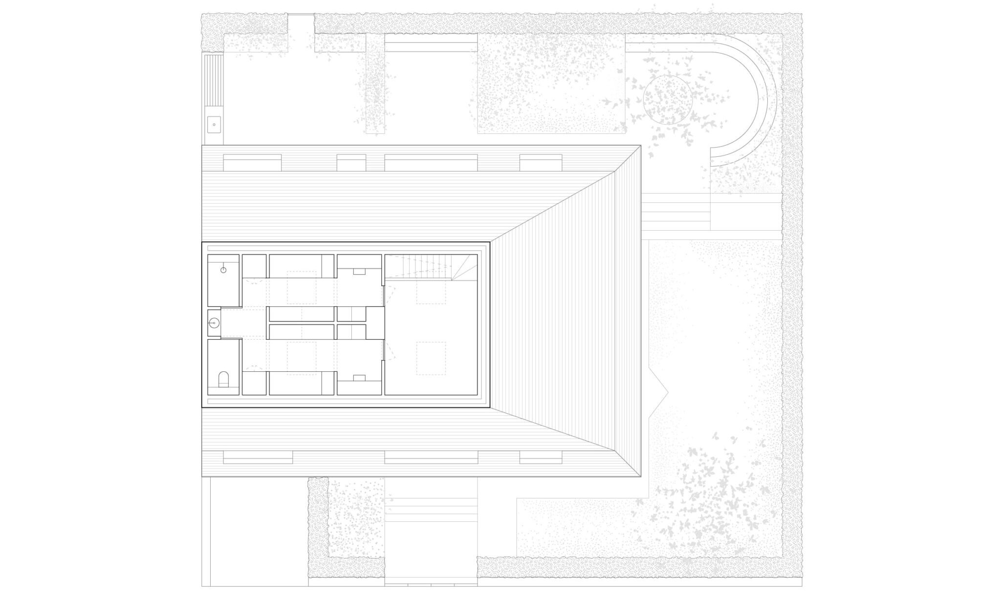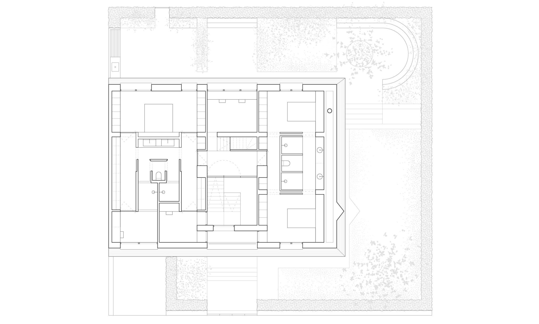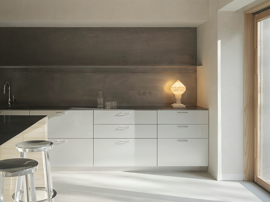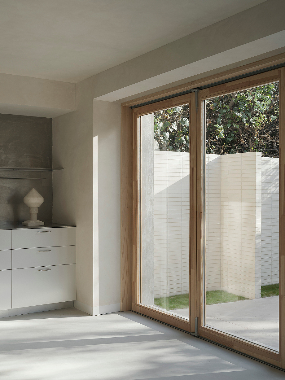 A través de una distribución radical y una implementación contundente pero sensible, la huella de la casa se dividió en tres bandas programáticas con un tamaño parecido a las que fueron incorporándose las diferentes funciones. La transformación de los ejes divisorios en muros equipados sirvió para acotar toda la planta. Estos elementos funcionan como armarios y, además, se perforaron para habilitar los pasos entre las estancias. El resultado es una secuencia de vistas encuadradas que ensalzan la continuidad y amplitud de toda la composición.